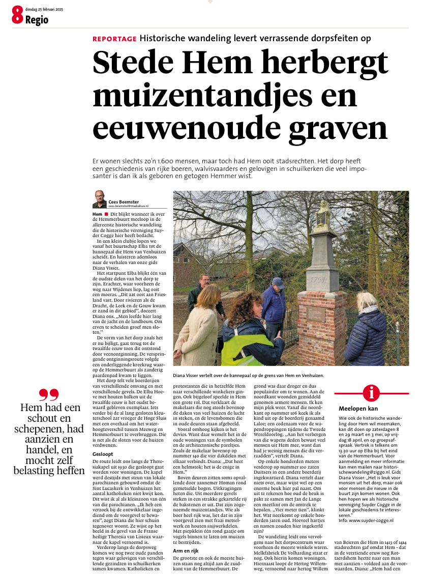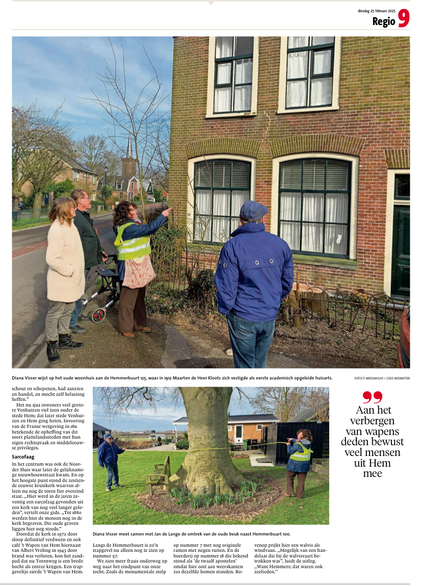 Met een gids gaat u op pad om uitleg te krijgen over de historie van het ontstaan, de opbouw van een gehucht, de groei naar stad en het latere opgaan in de gemeente Venhuizen en Drechterland. Er wordt aandacht besteed aan (rijks) monumenten, kerken, gebouwen, symboliek, straatnamen en bekende personen uit Hem. Dit met ondersteuning van verhalen en afbeeldingen. Duur ongeveer 2 uur.