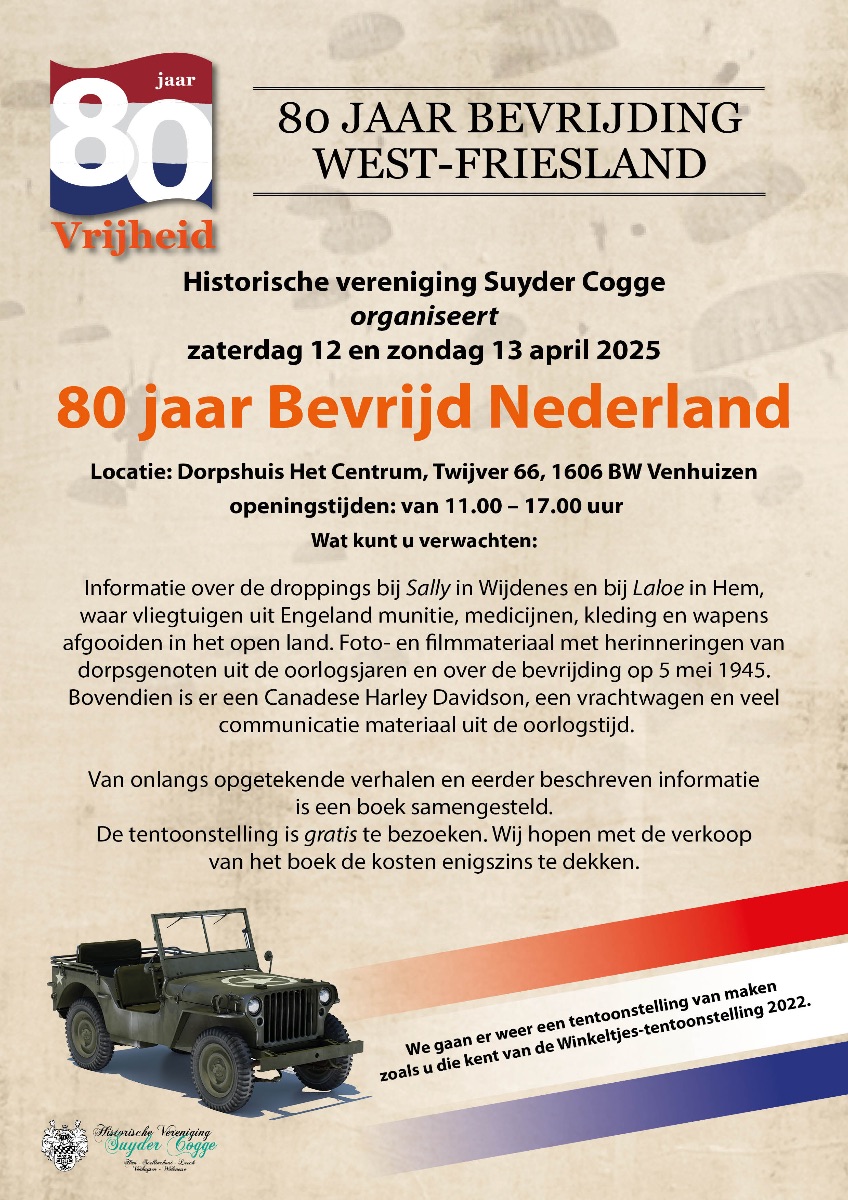 Op zaterdag 16 en zondag 17 oktober 2021 heeft in het Dorpshuis het Centrum te Venhuizen een door de historische vereniging Suyder Cogge georganiseerde tentoonstelling plaatsgevonden over 75 jaar Bevrijding Nederland. Bent u geïnteresseerd?